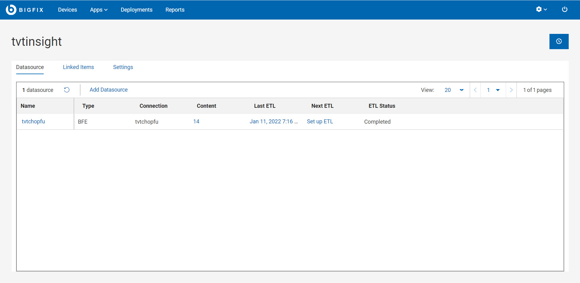 「BigFix Insights の詳細」ページの「データ・ソース」タブをクリックします。