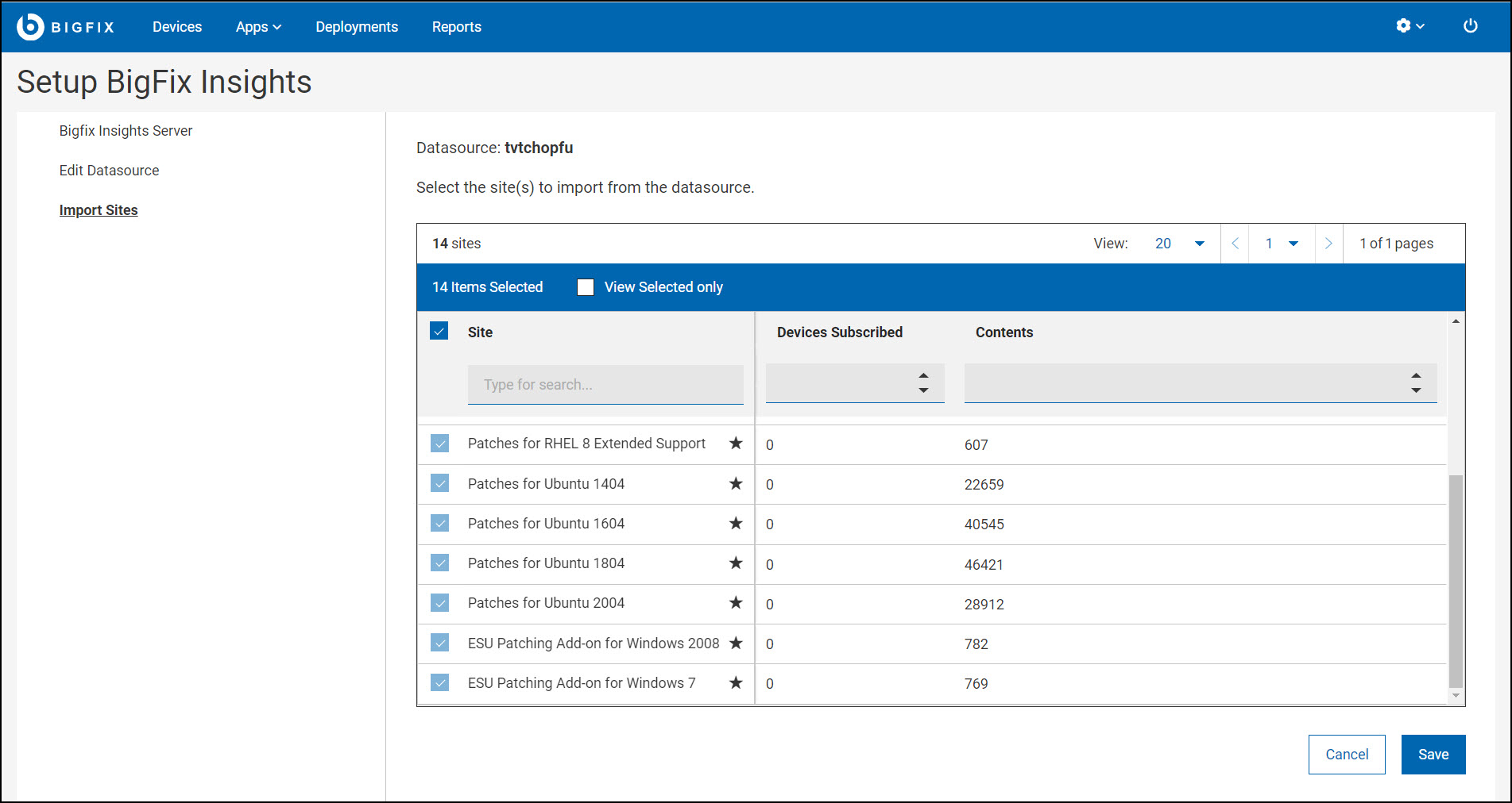 Note: 「サイト」 ページには、ユーザーがサイトを含めるか除外するかを選択するためのダイアログ・ボックスが用意されています。レポートする目的のサイトのみ追加する必要があります。例えば、チェックリスト・サイトやパッチ・コンテンツ・サイトはレポートする対象となる場合がありますが、リモート・コントロール・コンテンツ・サイトでは、目的のレポートをサポートするコンテンツは提供されません。これは各自の判断に任されています。しかし、一般に、追加されるサイトが増えるほど、取得するデータが増え、ETL のプロセスに必要な時間も長くなります。