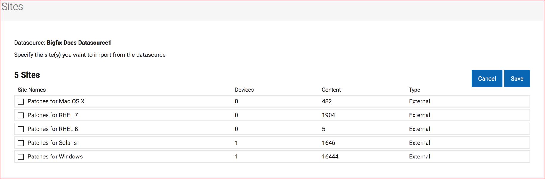 データ・ソース内のサイトが表示されます。これは、すべてのサイトが指定のデータ・ソースからインポート可能であることを表します。