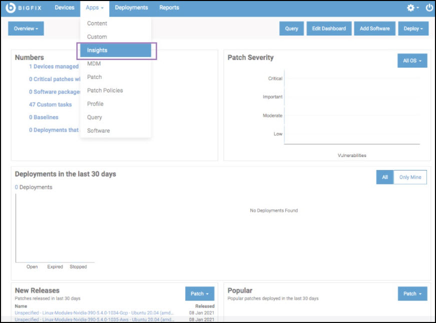 - 「アプリケーション」タブをクリックし、「Insights」をクリックします。