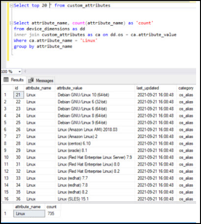 与えられたすべての Linux ディストリビューションと個々の Linux ディストリビューションごとのカウントのロールアップ・カウントを提供したいと考えています。これは、カスタム属性の活用が役立つ多くのユース・ケースの 1 つです。以下に示すデータを確認してください (2 つの照会があります)。最初の照会では、custom_attributes テーブルの内容が表示されます。テーブルにはさまざまなディストリビューションが取り込まれています。2 つ目の照会では、テーブルを活用してデータを正規化し、それに応じてデータをグループ化しています。この 2 つを一緒に使用することによって、すべての Linux ディストリビューションのオペレーティング・システムをロールアップする基本的なユース・ケースが可能になりました。