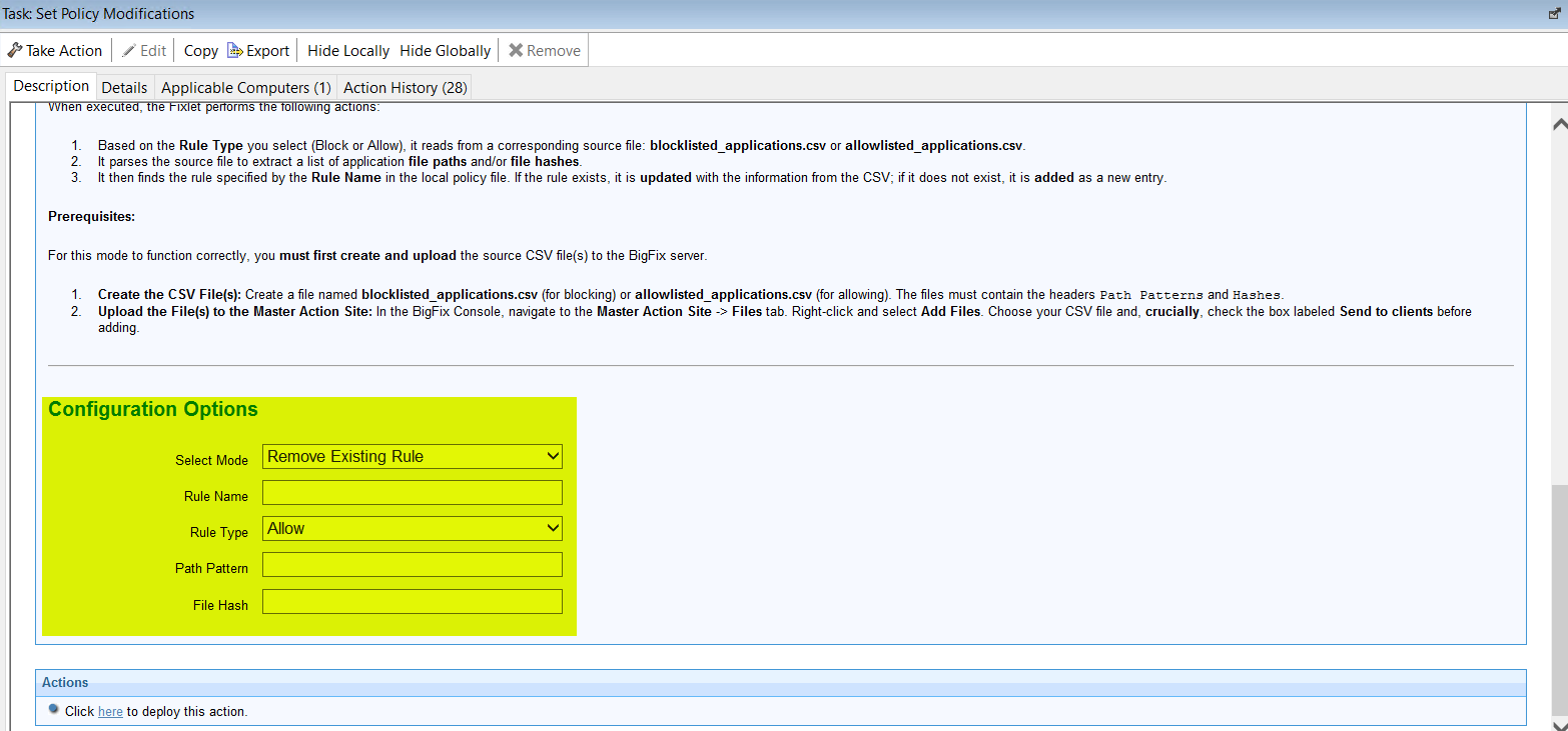 Table 1. Task: Set Policy Modifications Remove Existing Rule Mode Configuration Options Field Name Description Select Mode Select the mode: Remove Existing Rule. Rule Name Name of the rule. Rule Type Type of rule. Can be either Block or Allow. Path Pattern Path of the application or process to be allowed or blocked. File Hash Hash value of the application file. Note: For full rule deletion, update only the Rule Name and Rule Type fields. But for a partial rule modification, you will need to update all the fields. - Select the Take Actions tab and select the endpoints from which you want to remove the rules.