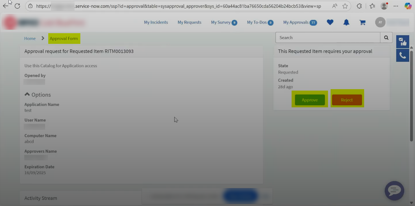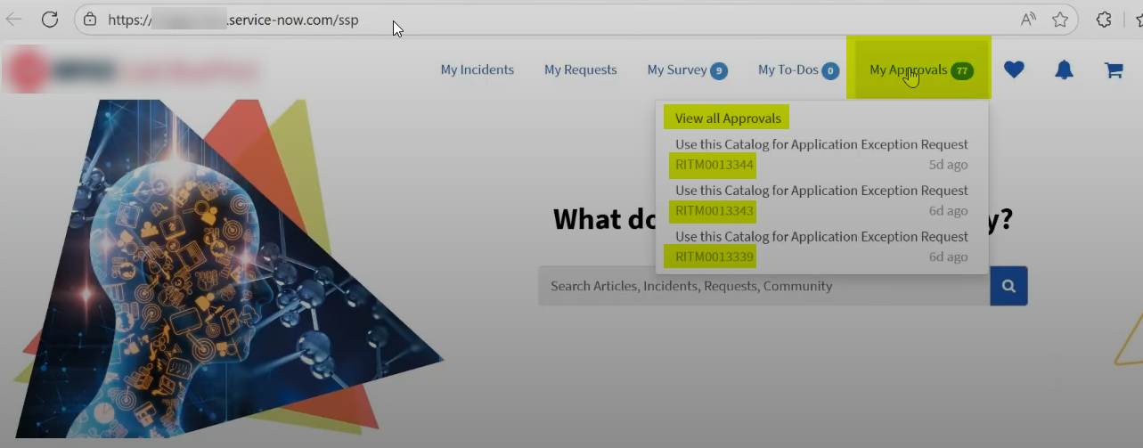 This topic provides a step-by-step instructions for exception managers to review and approve pending exception requests for blocklisted applications in ServiceNow™. It also covers how exception managers can effectively track all approved exceptions raised by endpoint users for blocklisted applications in ServiceNow. This process is essential for maintaining accurate audit records and ensuring compliance. By following the outlined steps, managers can efficiently manage approval requests through the ServiceNow™'s service portal.