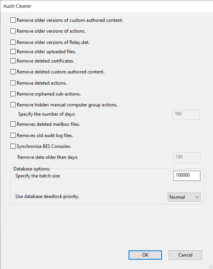 Use this tool to clear historical data, used as audit trail, from the bfenterprise database. The audit trail contains deleted and previous versions of Fixlets, tasks, baselines, properties, mail boxes, actions, and analyses.
