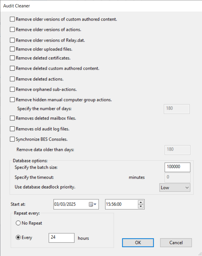 - Remove old audit log files - Remove old server_audit.log files to prevent the server running out of disk space. If the _BESAdminAudit_Logging_LogDirectoryPath client setting is not used, on Windows the audit log files may not be deleted from the Audit Cleaner Removes old audit log files function. For more details, refer to Server audit logs.