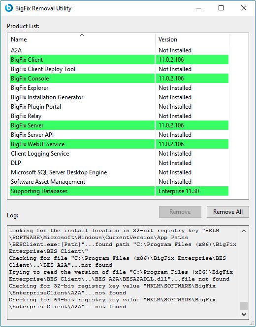 - Select the components that you want to uninstall and then click Remove, or click Remove All to remove from the system all the BigFix components installed.