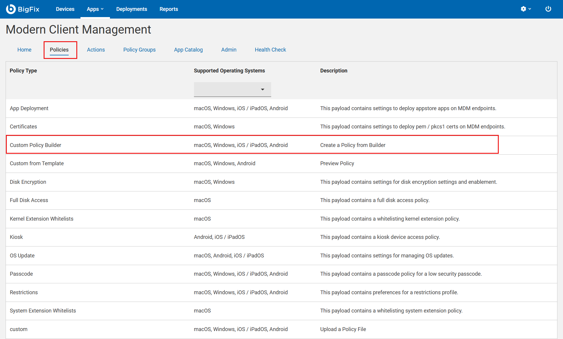 - Select an Operating System: From the Custom Policy Builder page, choose the OS for which you need a DDF.