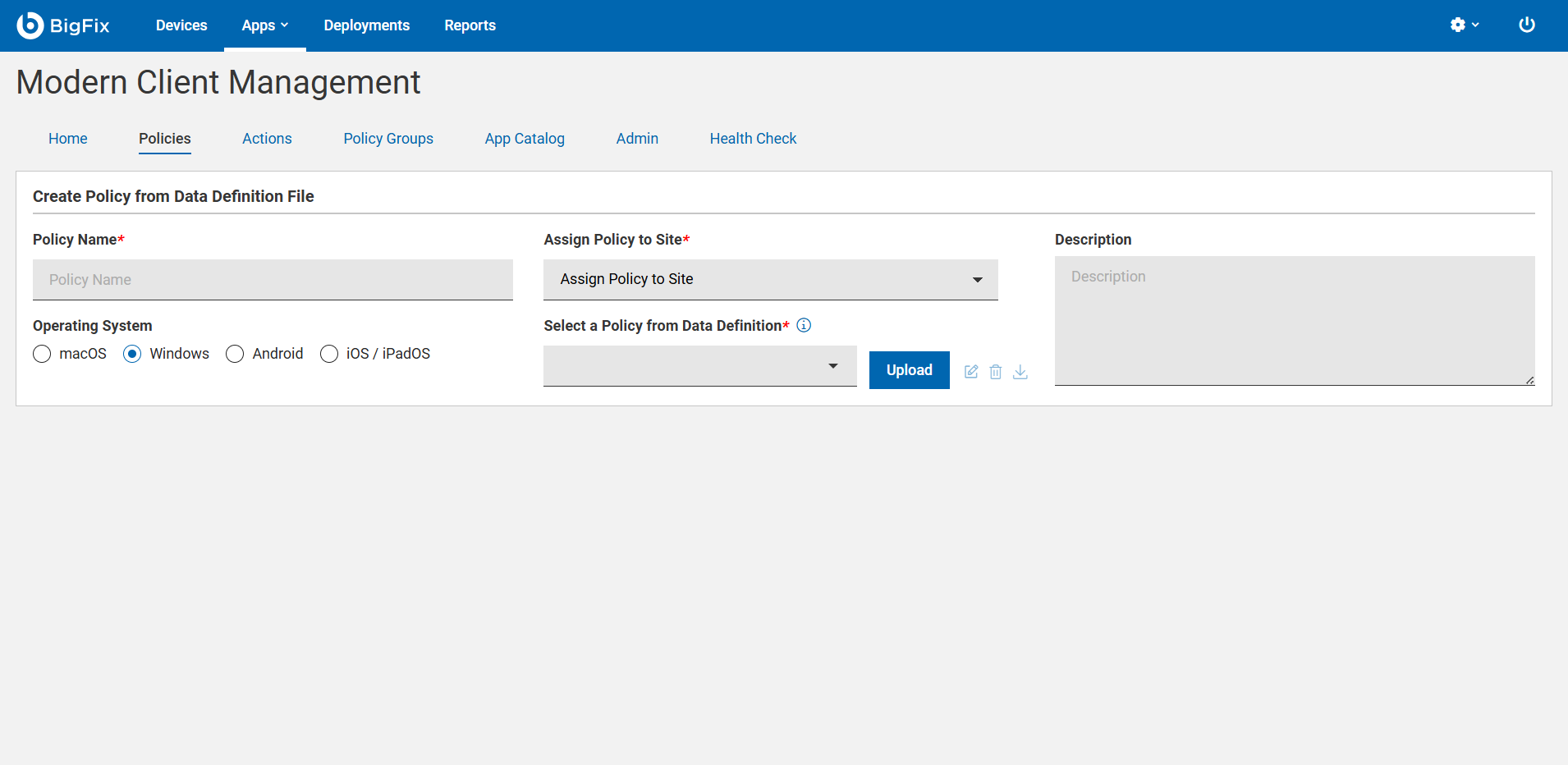 - To create a policy from the preloaded Data Definition File (DDF), from the Select a Policy from Data Definition drop down menu, select a DDF.