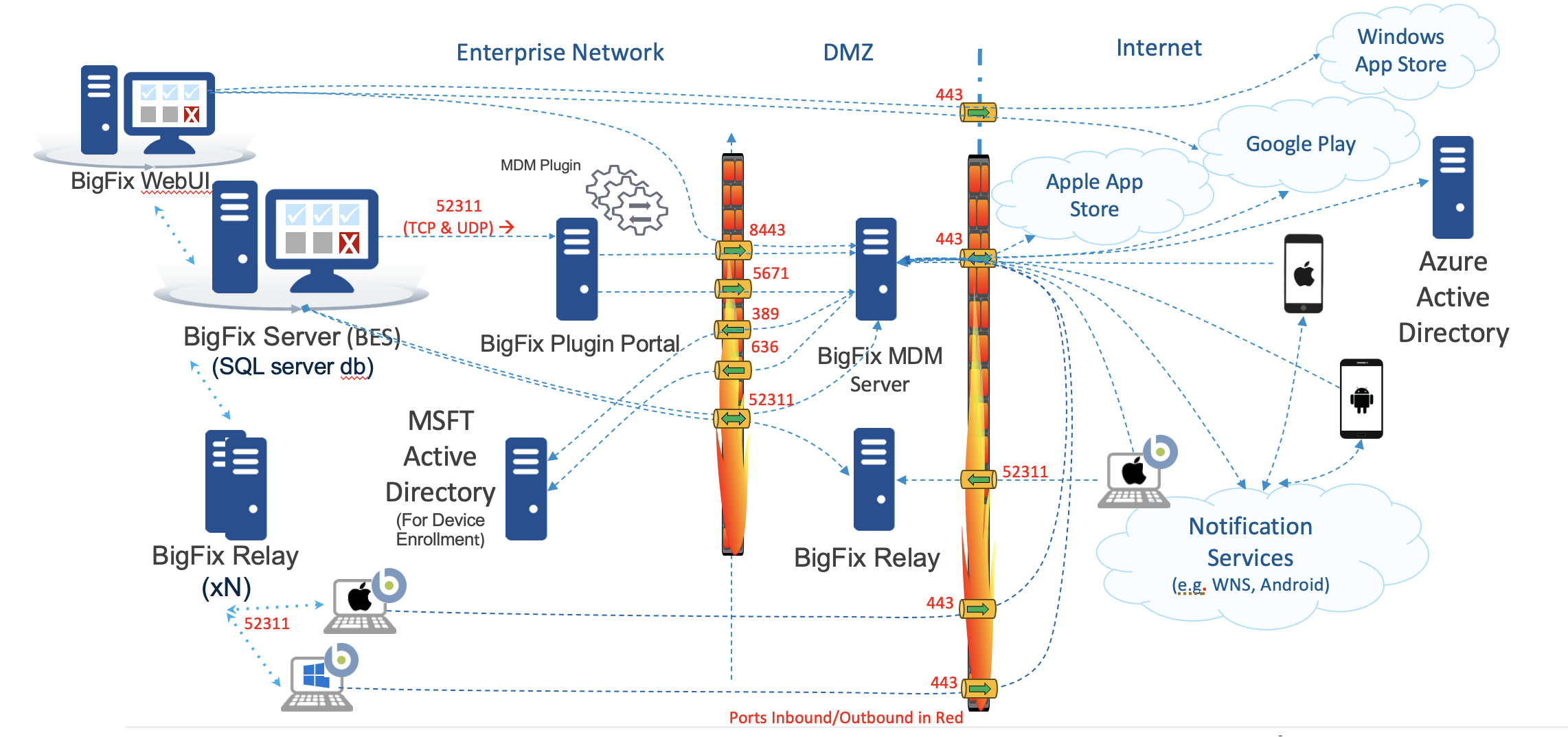 | 52311 | TCP | For standard BigFix management traffic to the BESAgents that manage the MDM server and Plugin Portal server. | Inbound to the MDM Server and the Plugin Portal server from the root server |