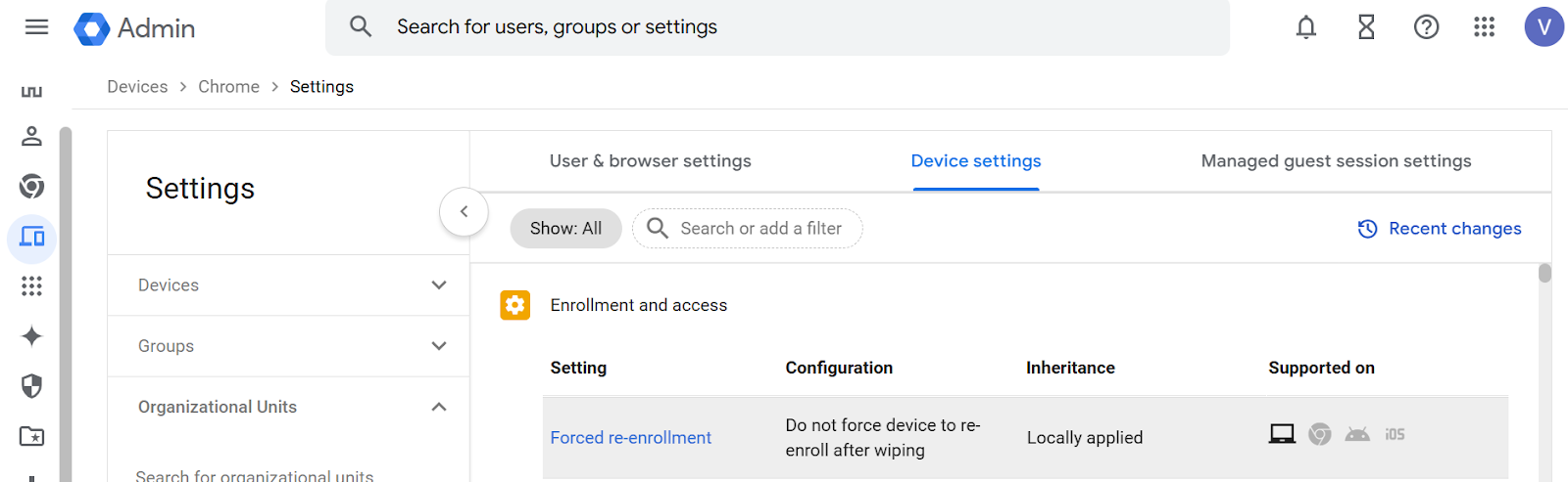 Click on Forced re-enrolment, and select “Do not force device to re-enroll after wiping”