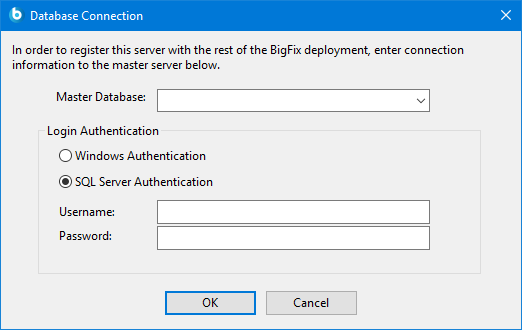 - In the Master Database Server dialog, enter the hostname or IP