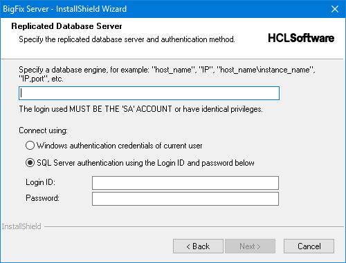 - In the Select Database dialog, you can choose the Local Database option to host the secondary server's own database locally. When choosing this option, the LocalSystem user will be used to access the local database through Windows authentication. However, this user only exists locally, so you will have to use SQL Server authentication to access the primary server's database. Alternatively, you can choose "Remote Database" and specify the local computer as the host, or an actual remote computer.