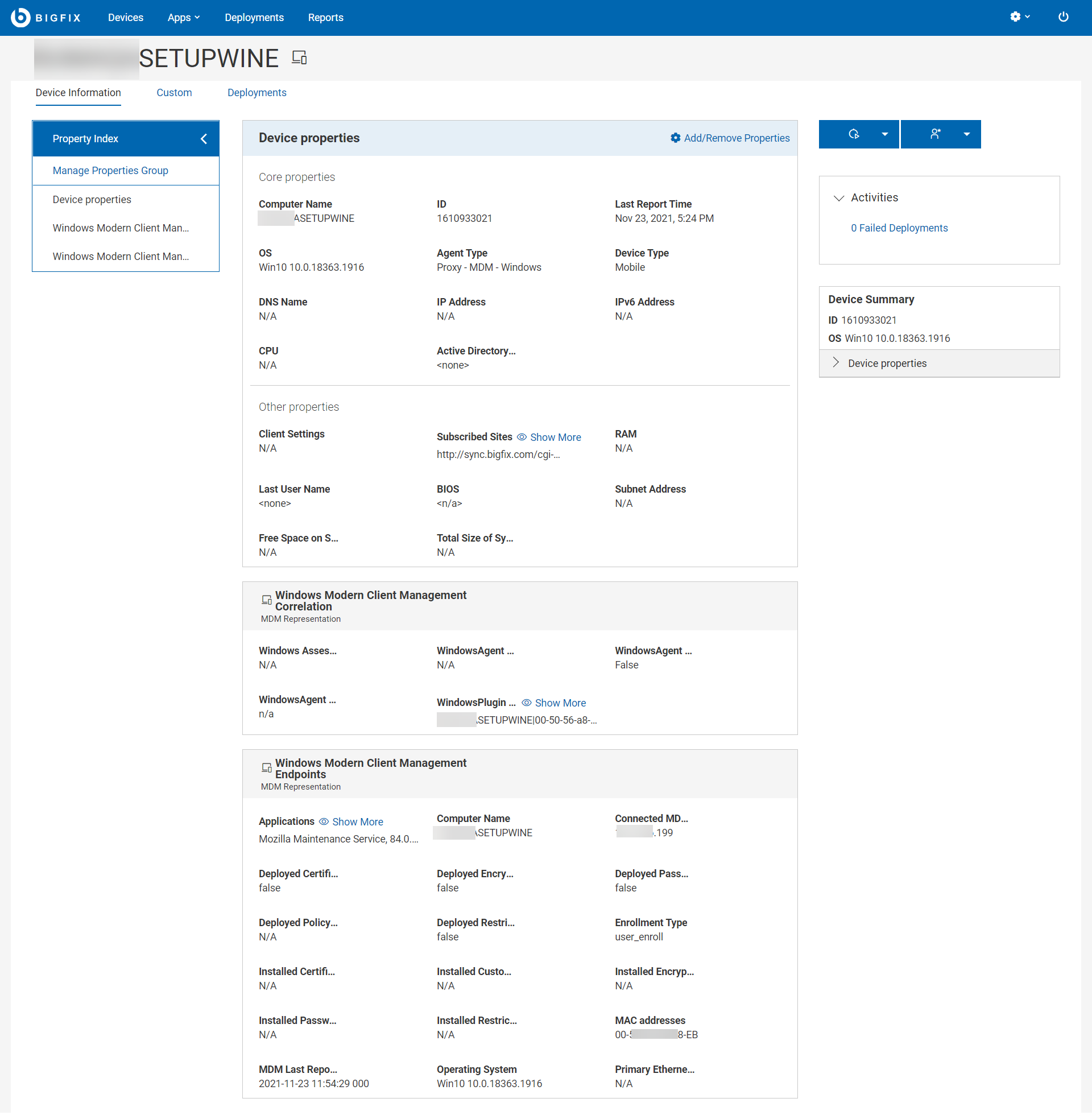 - Deploy BigFix Agent: Allows users to deploy the BigFix agent on MDM devices that do not have the BigFix agent deployed on it.