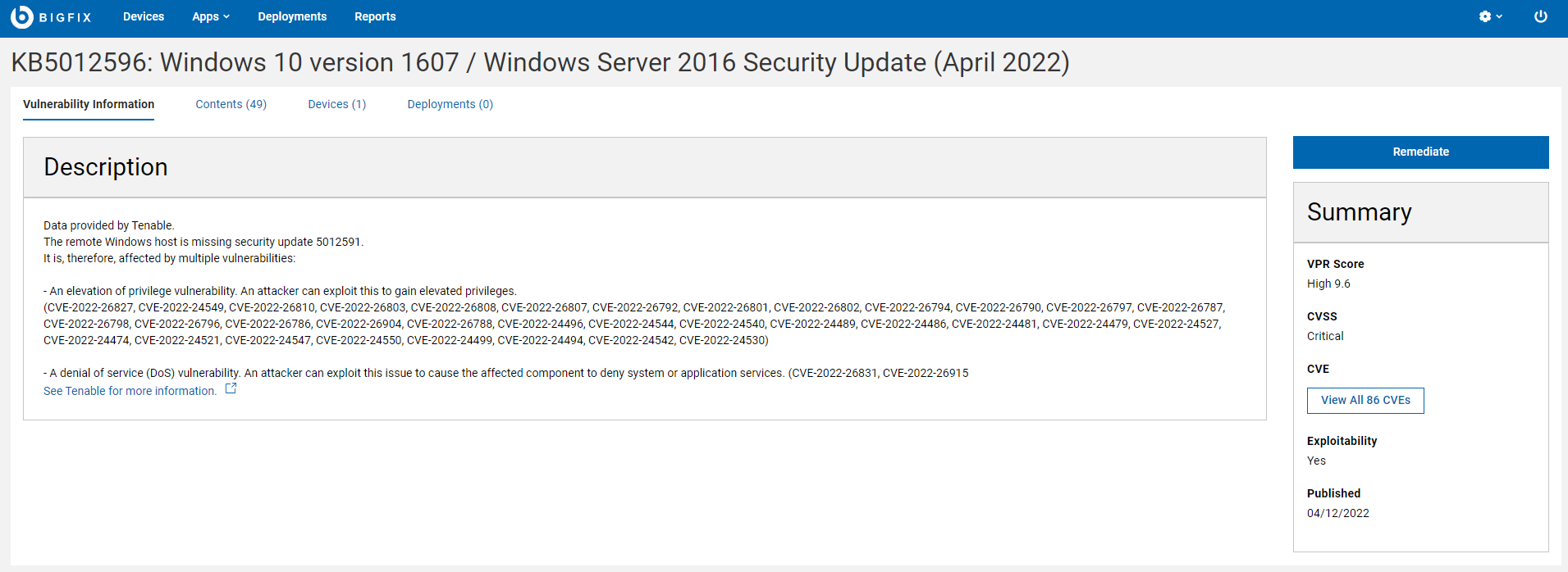 With the BigFix Insights for Vulnerability Remediation (BFIVR) document you can see the description of the vulnerability, vulnerable devices, and deployment history details. Drill further into vulnerability details by using the links to associated views.