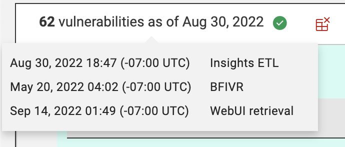 Hover the mouse over the vulnerability list count to see the dates and times updated upon the most recent WebUI retrieval.