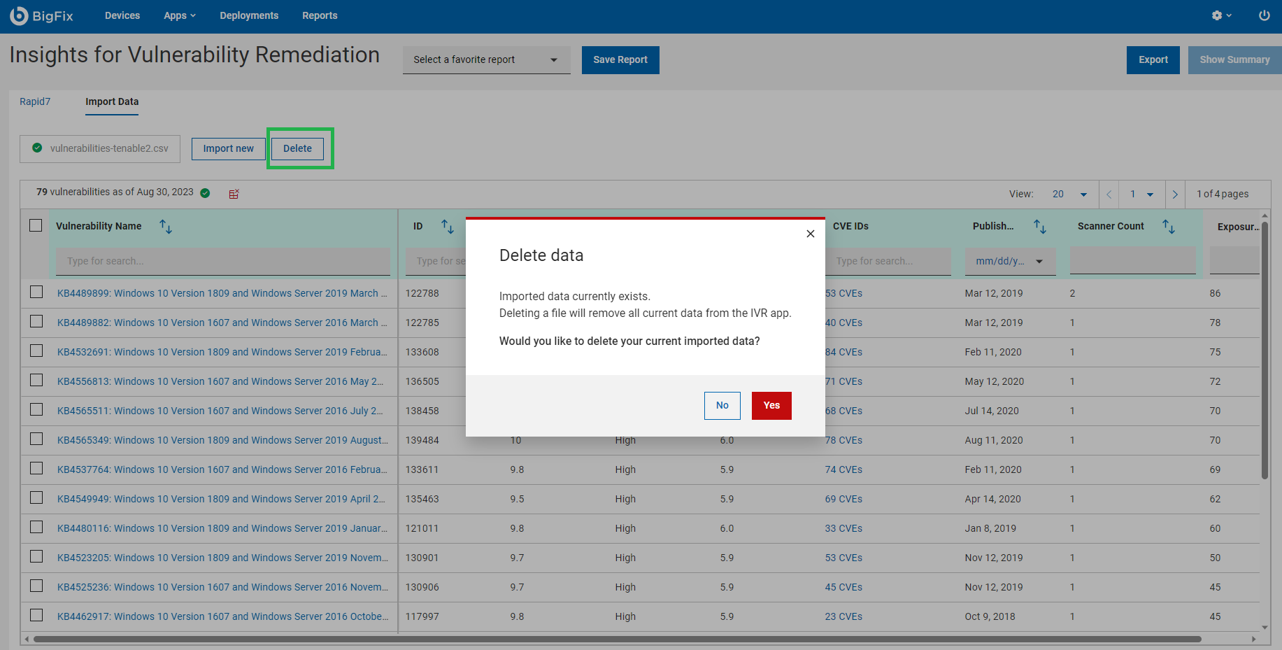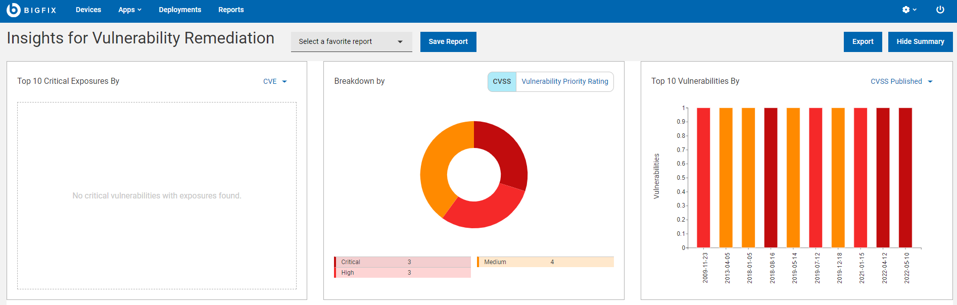 The BigFix Insights for Vulnerability Remediation (IVR) application in the WebUI provides a quick summary of all vulnerabilities in a data grid format. With the application you can remediate vulnerabilities and create custom IVR reports.