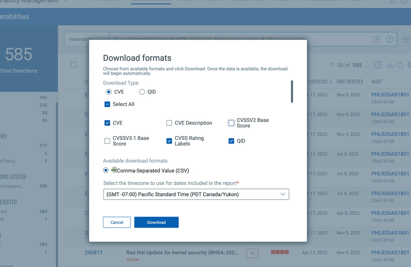 You may choose to Select All or select inividually following fields: CVE, CVSS Rating Labels, QID, Title, KB Severity, Severity, CVSS Rating Labels, CVE, Solution, Asset ID, Published Date, Threat, Category.