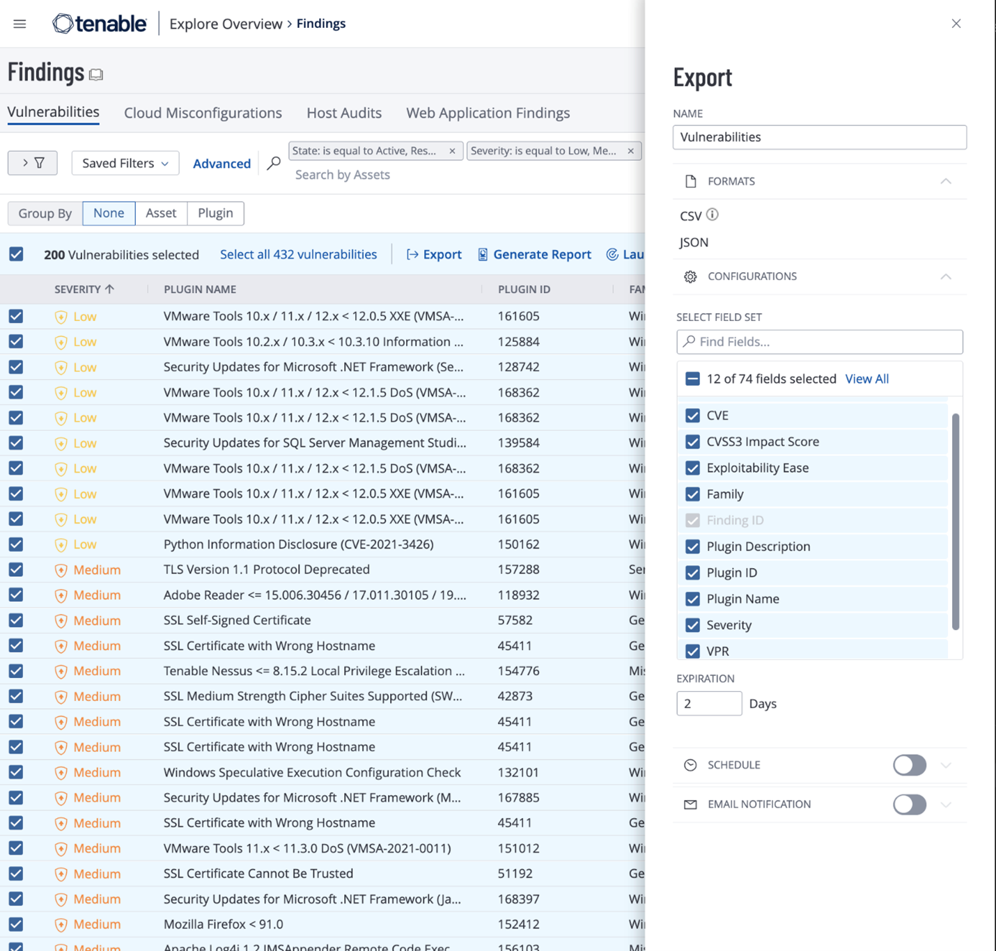 - Under Configurations, select the following fields: Asset ID, CVSS3 Impact Score, Exploitability Ease, Family, Plugin Description, Plugin ID, Plugin Name, Severity, VPR, Vulnerability Published.