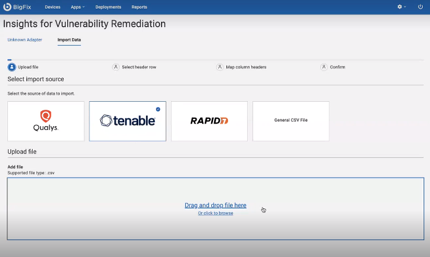 - Select the import source: Qualys, Tenable, Rapid 7, or generic CSV file and