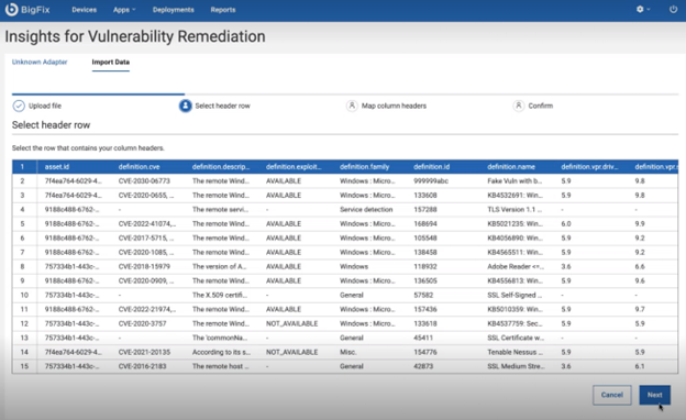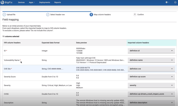 WebUI IVR maps the imported vulnerabilities to Fixlets. You can select the vulnerability and remediate it while the correlation is still in progress in the background. List of vulnerability Ids that were not able to be mapped to at least one Fixlet can be found in the debug logs. Additional information about why particular rows in the CSV file have been marked invalid can be found in the file: <Program Files>\BigFix Enterprise\BES WebUI\WebUI\sites\WebUI IVR_XXXXX_XXXXXXXXX\IVR_CSV_INVALID_ROWS.