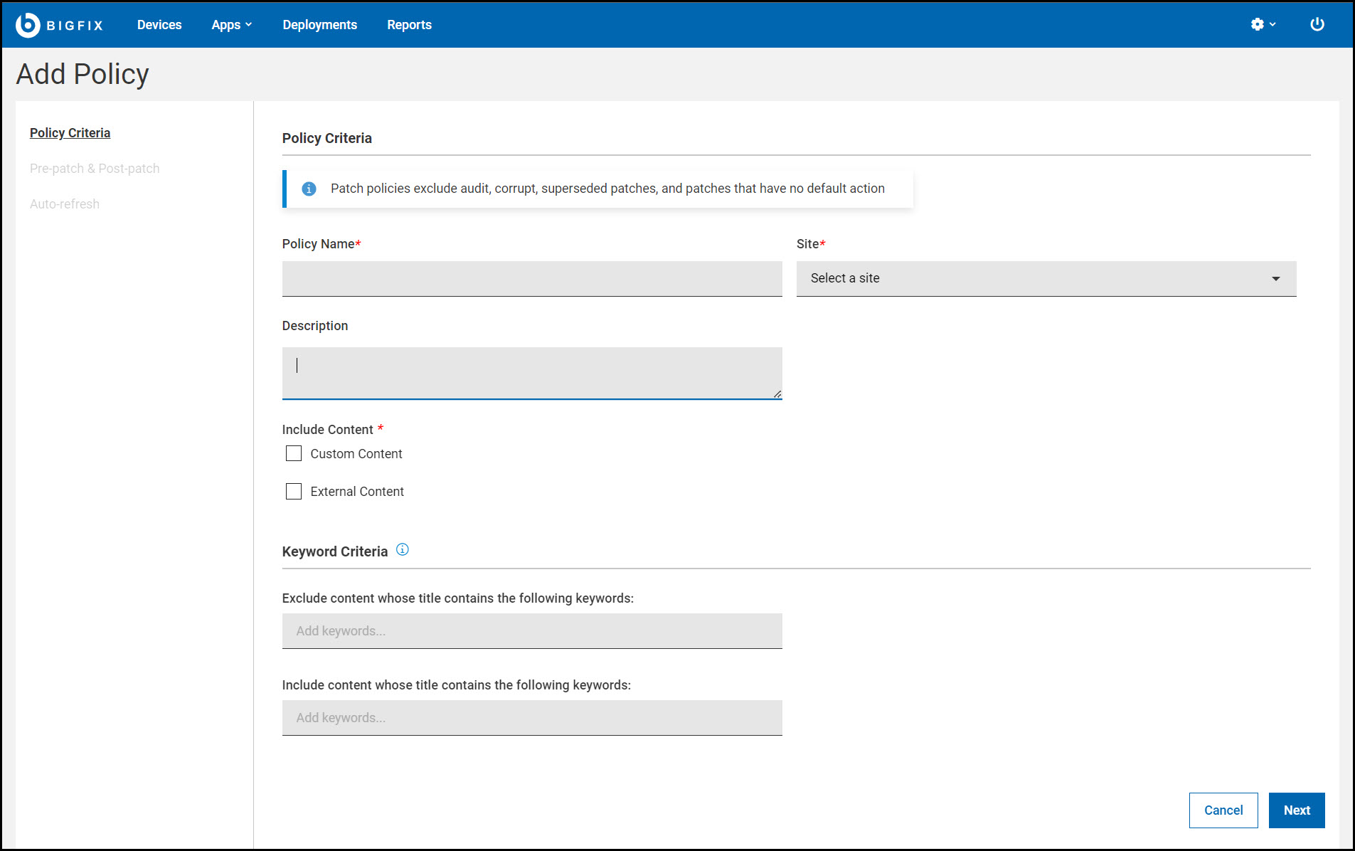 Note: While creating the patch policy, ensure the following:- Fixlets must have a default action. If not, the Fixlets will not be included in the patch policy.