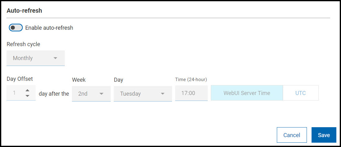 - Refresh cycle (daily, weekly, monthly), on a specific day (of week/month) at (hour).