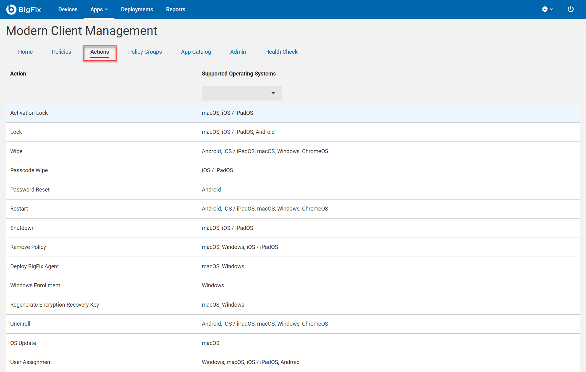 - The MDM Actions page displays all the possible actions along with the supported operating system for every action. You can also filter applicable actions by using the Supported Operating Systems filter. Click on the specific MDM action you want to deploy on MDM endpoints.
