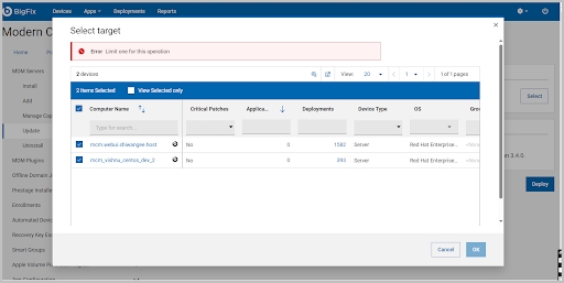 In the Target Devices section, click Edit Devices. A list of the available servers that need an update is displayed. Select the required servers and click OK.