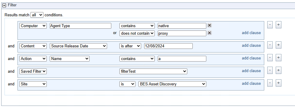 "filterDescription":"{\"matchType\":\"all\",\"conditionList\":[{\"selectedContentTypeName\":\"Computer\",\"selectorList\":[{\"selectedOperatorName\":\"contains\",\"selectedOperatorValue\":\"native\"},{\"selectedOperatorName\":\"does not contain\",\"selectedOperatorValue\":\"prova\"}],\"selectedProperty\":{\"analysis\":null,\"type\":\"reserved\",\"id\":\"R-Agent Type\",\"name\":\"Agent Type\",\"displayName\":\"Agent Type\"}},{\"selectedContentTypeName\":\"Fixlet\",\"selectorList\":[{\"selectedOperatorName\":\"is after\",\"selectedOperatorValue\":\"12\u002f8\u002f2024\"}],\"selectedProperty\":{\"name\":\"Source Release Date\",\"id\":\"Source Release Date\"}},{\"selectedContentTypeName\":\"Action\",\"selectorList\":[{\"selectedOperatorName\":\"contains\",\"selectedOperatorValue\":\"a\"}],\"selectedProperty\":{\"name\":\"Name\",\"id\":\"Name\"}},{\"selectedContentTypeName\":\"Saved Filter\",\"selectorList\":[{\"selectedOperatorName\":\"saved filter\",\"selectedOperatorValue\":\"1\"}],\"selectedProperty\":{\"id\":\"\",\"name\":\"\"}},{\"selectedContentTypeName\":\"Site\",\"selectorList\":[{\"selectedOperatorName\":\"is\",\"selectedOperatorValue\":\"{\\\"BESSiteID\\\":{\\\"DatabaseSiteID\\\":3107}}\"}],\"selectedProperty\":{\"id\":\"BESSiteID\",\"name\":\"BESSiteID\"}}]}",
