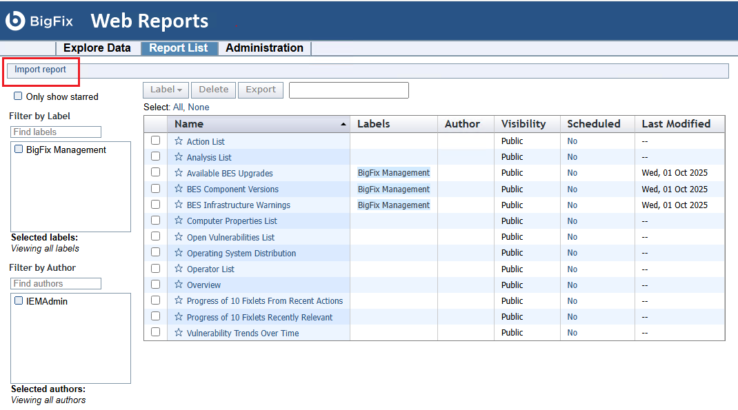 The top link on the Report List page allows you to import a report.