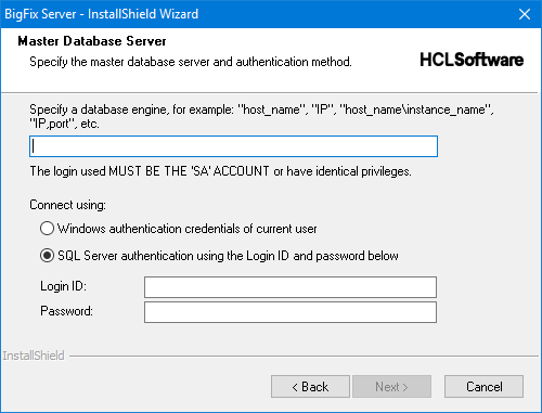 - In the Master Database Server dialog, enter the hostname or IP