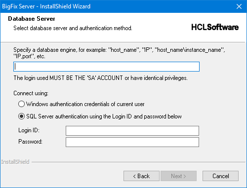 - Use the same authentication method to access all the SQL Server database engines, either Windows authentication or SQL Server authentication. If you chose the Windows authentication method, use the same domain user to access all your database engines. If you chose the SQL Server authentication method, use the same user name and password. Ensure that your database user has sysadmin privileges on all database engines.
