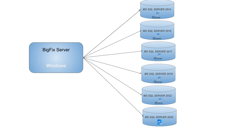 Starting from BigFix Version 11 Patch 6, the Windows Server installation introduces the support of Windows Server 2019 (or later) x86 64-bit with Microsoft SQL Server 2025 database.