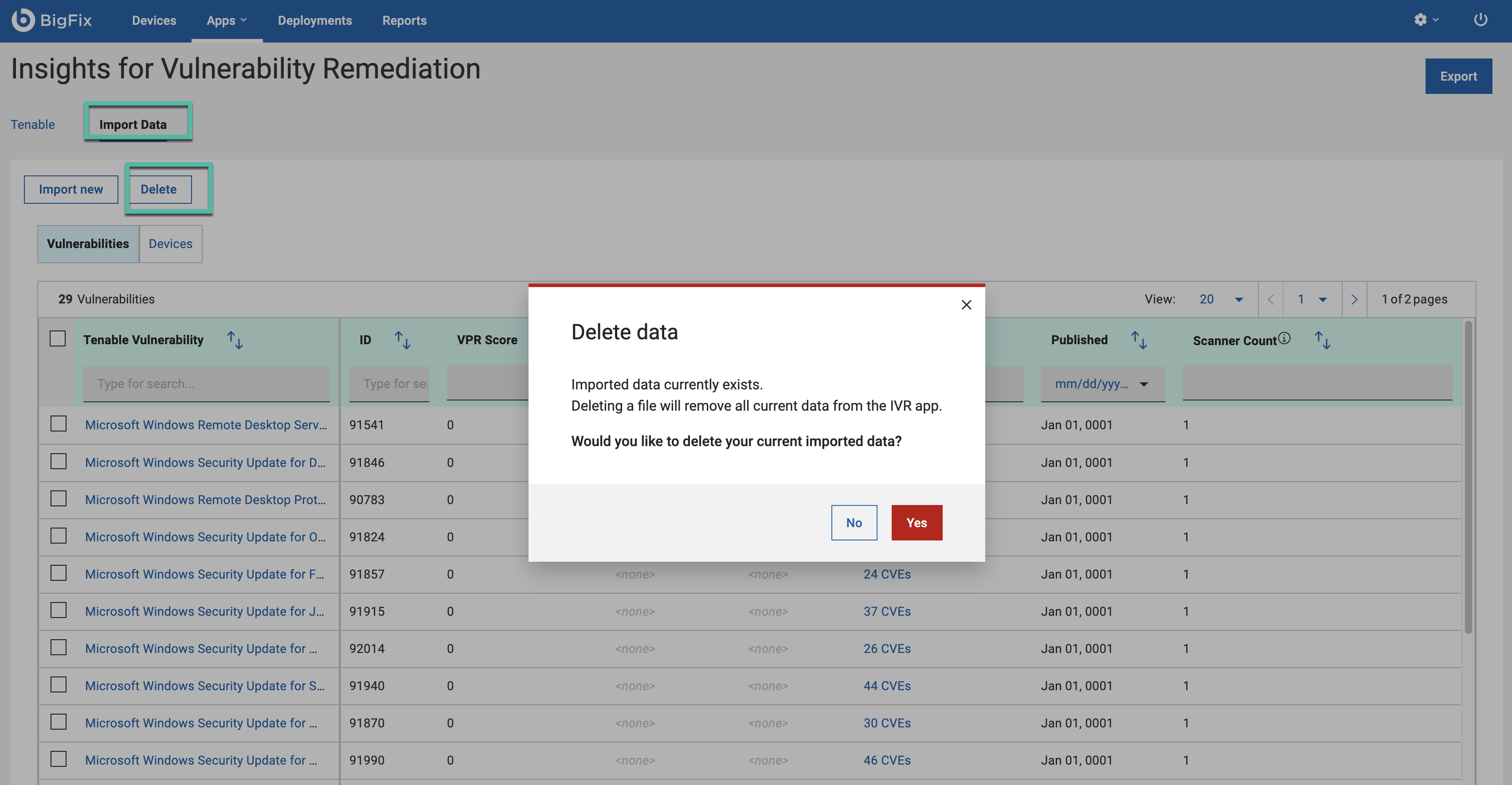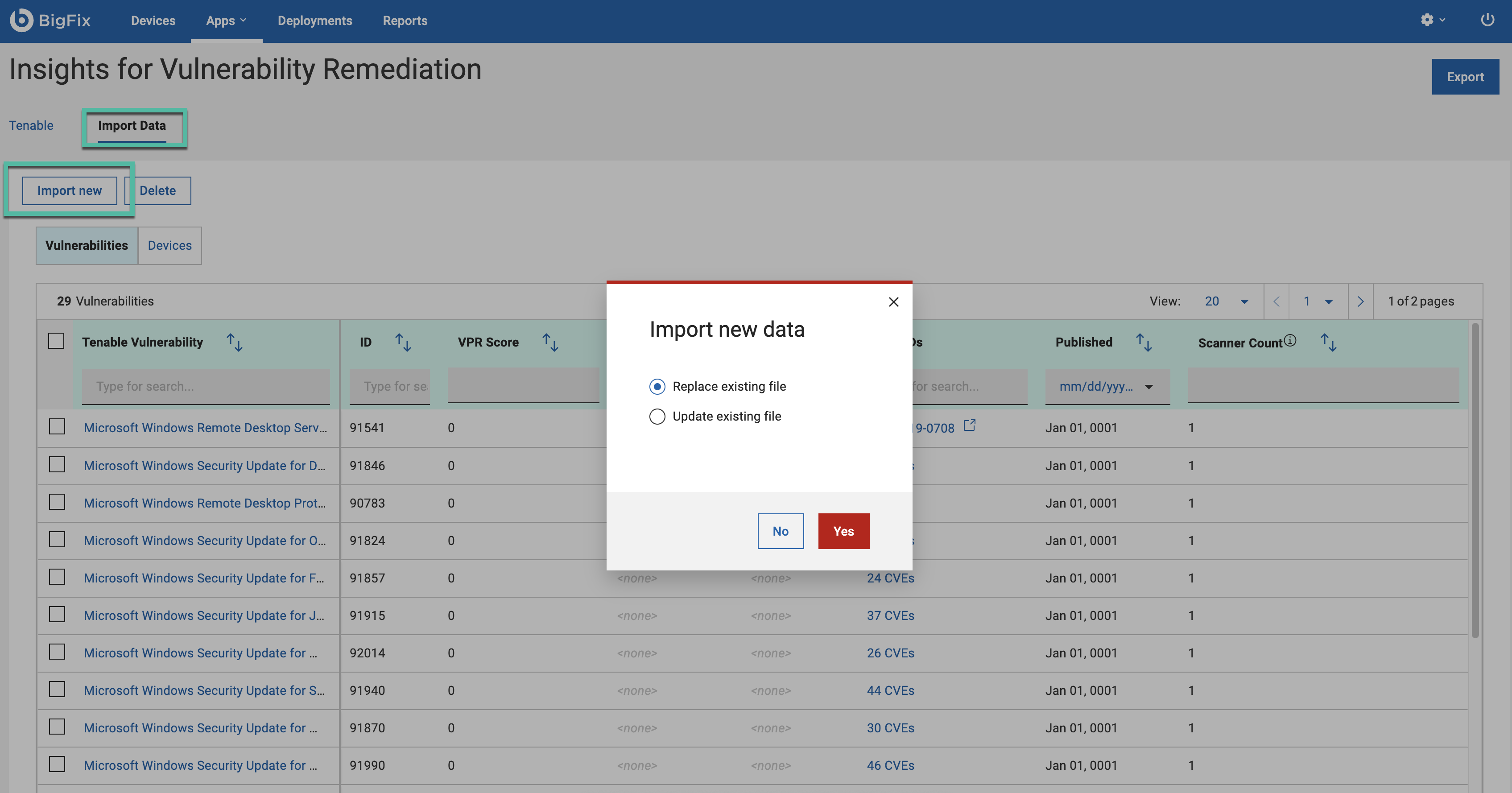 Note: If you cancel the upload, only part of the file will be uploaded.Important: Once the IVR service starts, it may take a few minutes for the background processing to complete. During this period, the File Import option will be disabled, and you will not be able to select any files. - Once confirmed, the IVR app will integrate the vulnerability report into its