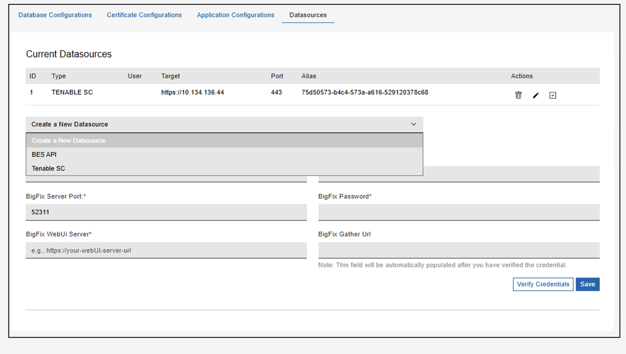 Note: It is recommended to avoid using a trailing slash in the BigFix WebUI Server/Bigfix Server fields for the BigFix API Credentials in the DataSources tab.The Tenable keys (access and secret keys) must have sufficient permissions or admin-level access to successfully call the required APIs.