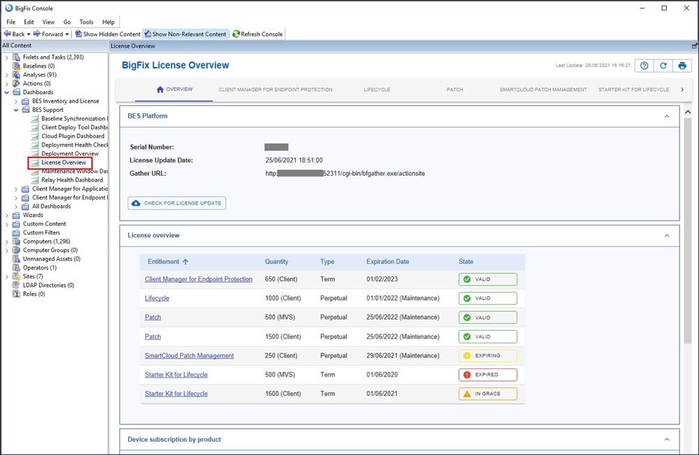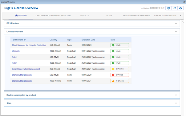 - Overview tab: reports a summary of your BES Platform license status as well as a “License overview”, a “Device subscription by product” and a “Sites” tables.
