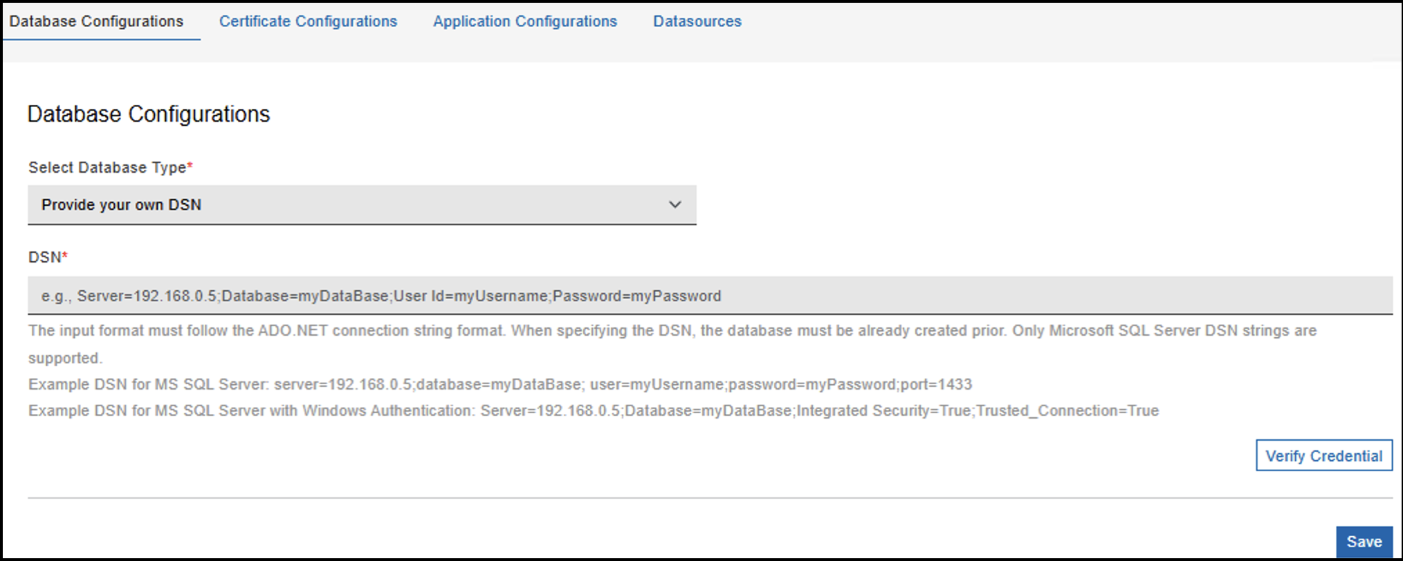 When selecting Provide your own DSN during the IVR4 setup, you need to provide a DSN (Data Source Name) string that allows the application to connect to your database server. The format of the sample DSN is given in the below screenshot.