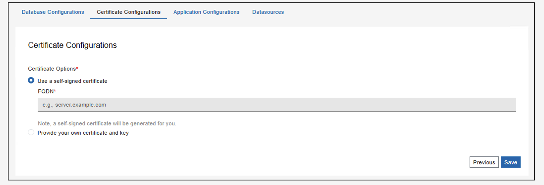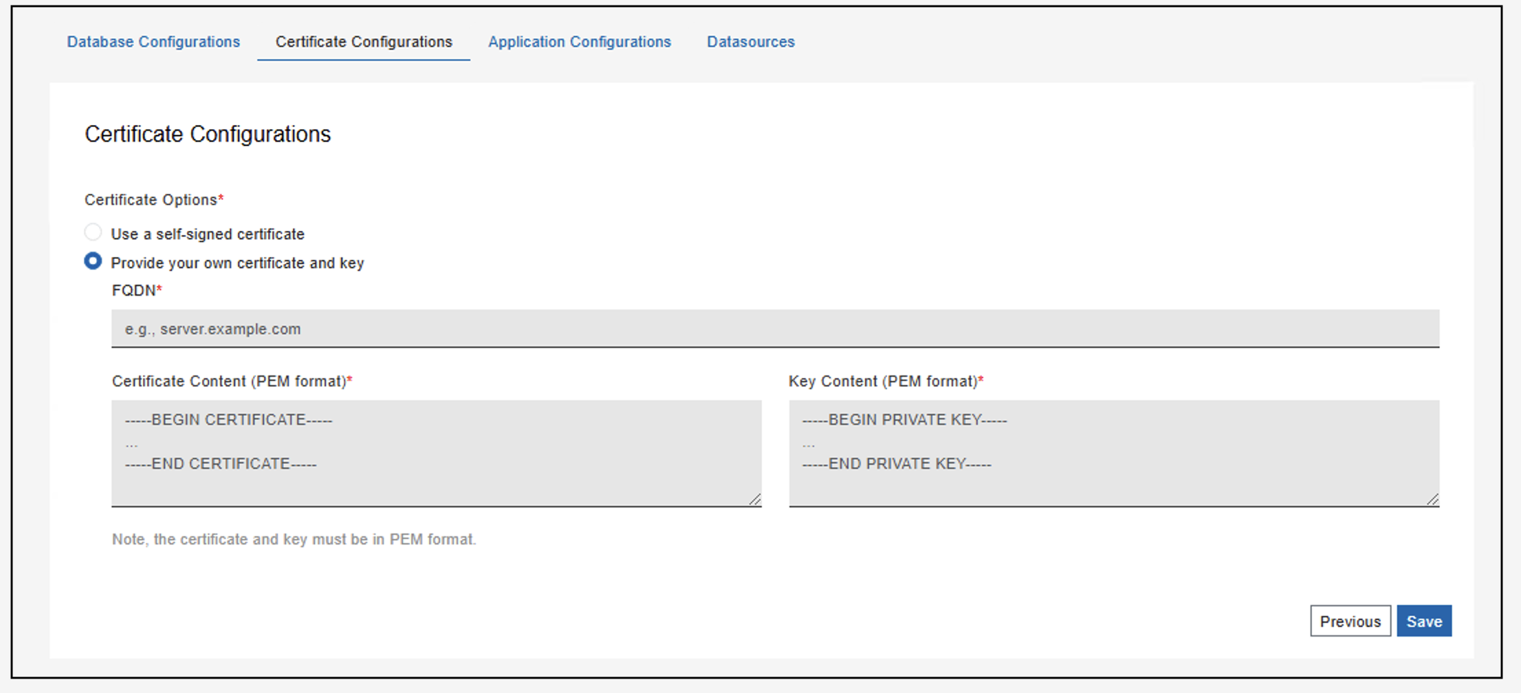 The below screenshot shows the second option: Provide your own certificate and key. Here the certificate and the key content should be given in the PEM format.
