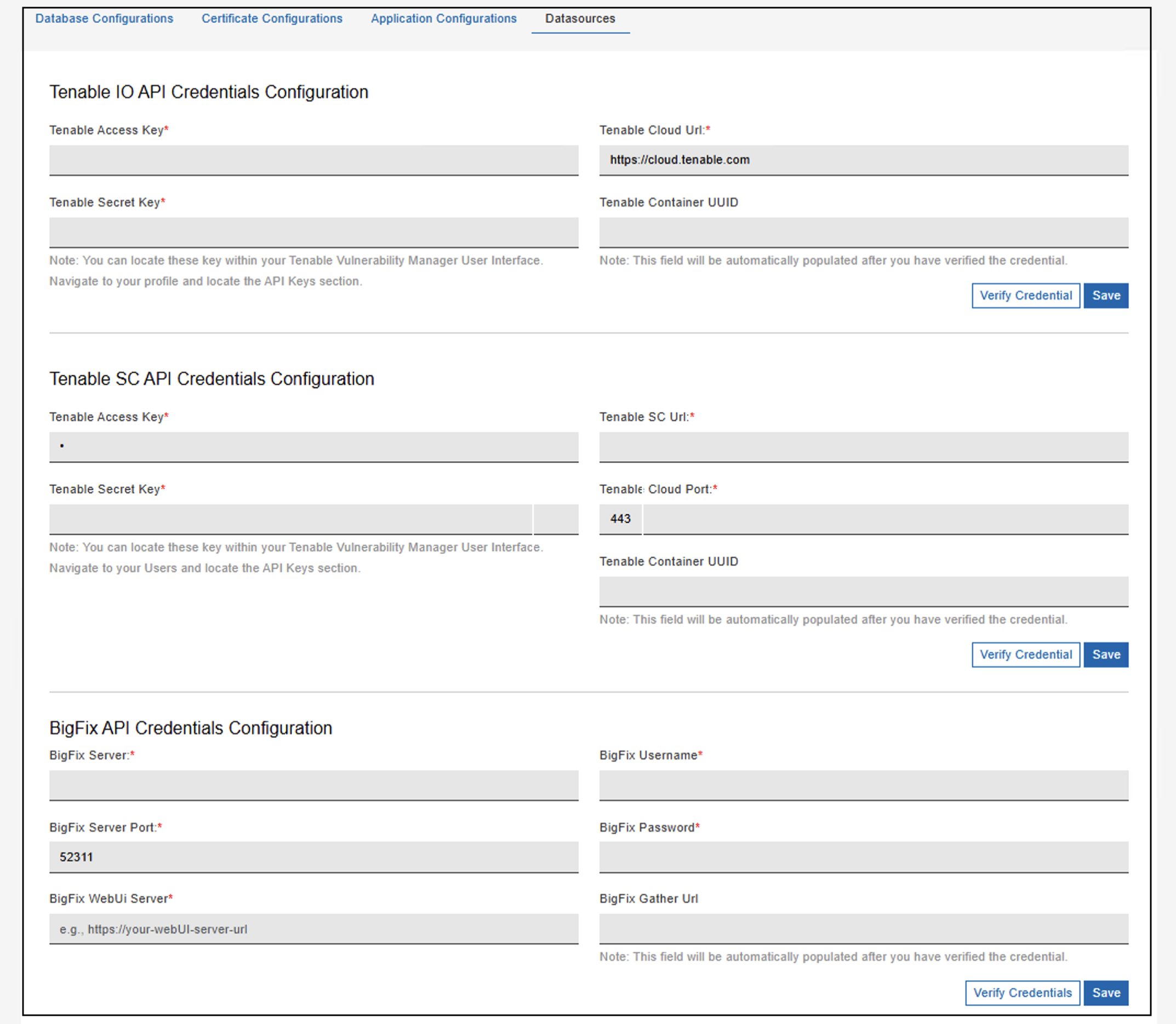 You can enter the Tenable IO API/Tenable SC API Credentials Configuration and Bigfix API Credentials Configuration.