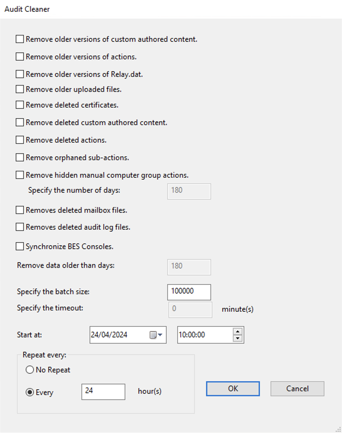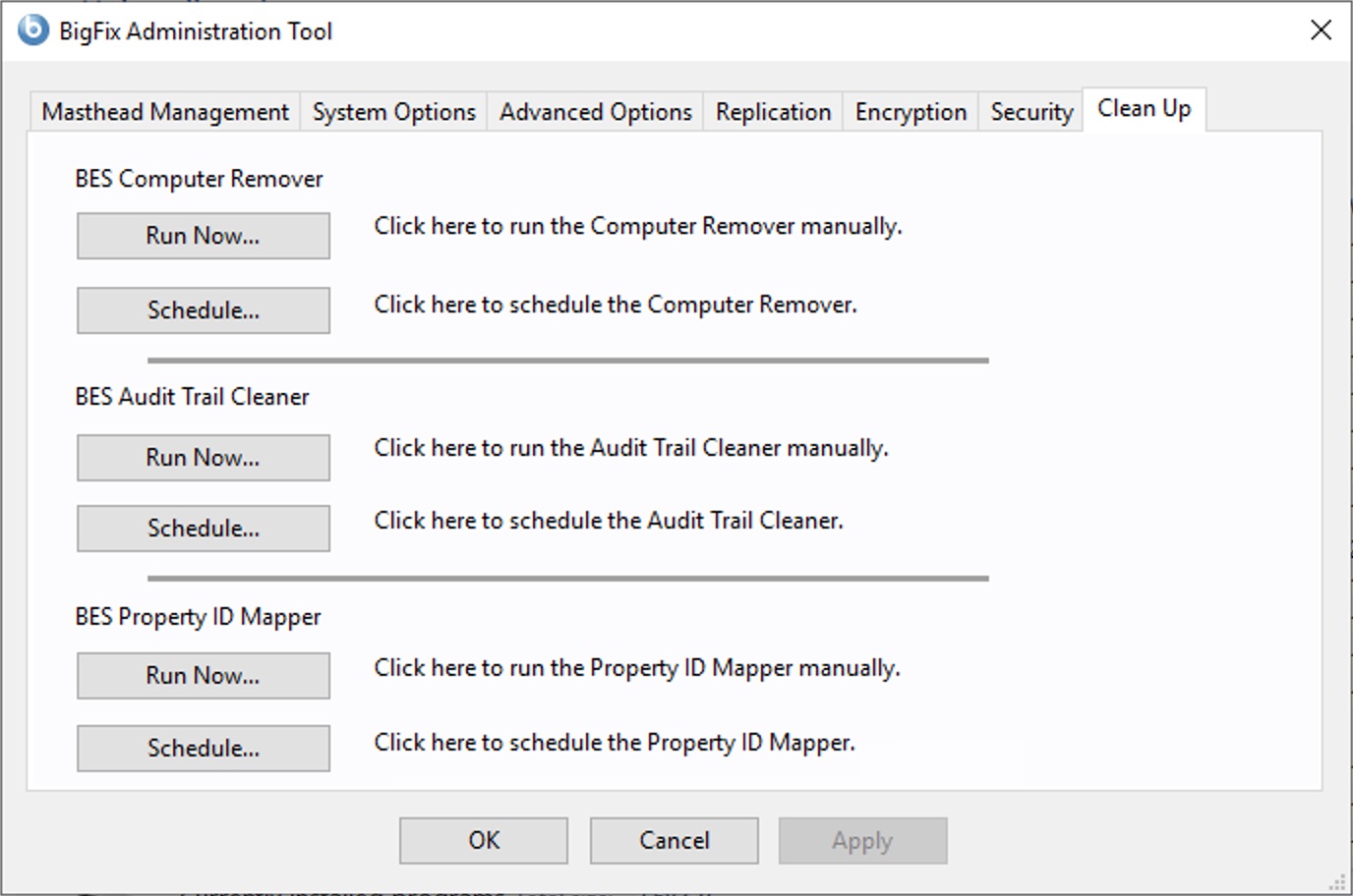 Use this tool to clear historical data, used as audit trail, from the bfenterprise database. The audit trail contains deleted and previous versions of Fixlets, tasks, baselines, properties, mail boxes, actions, and analyses.
