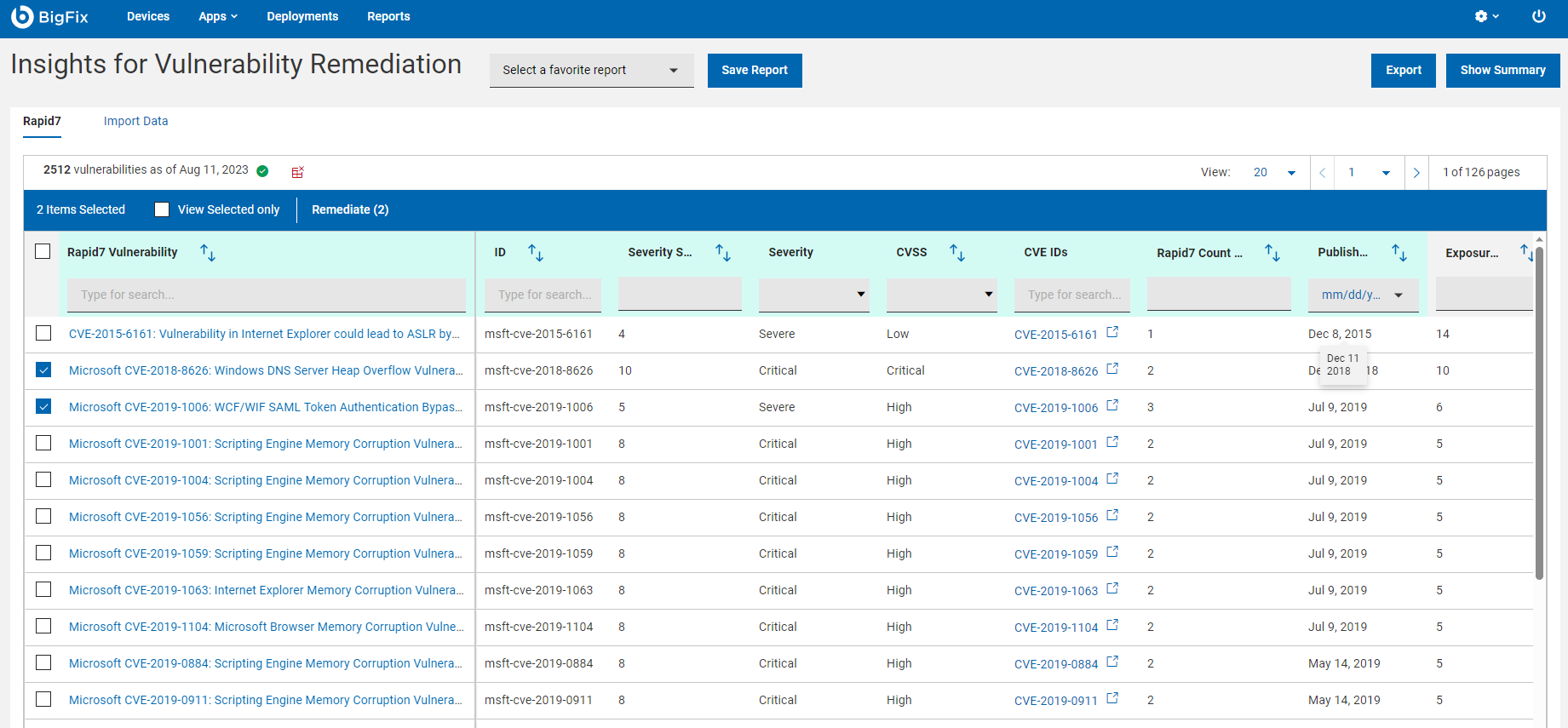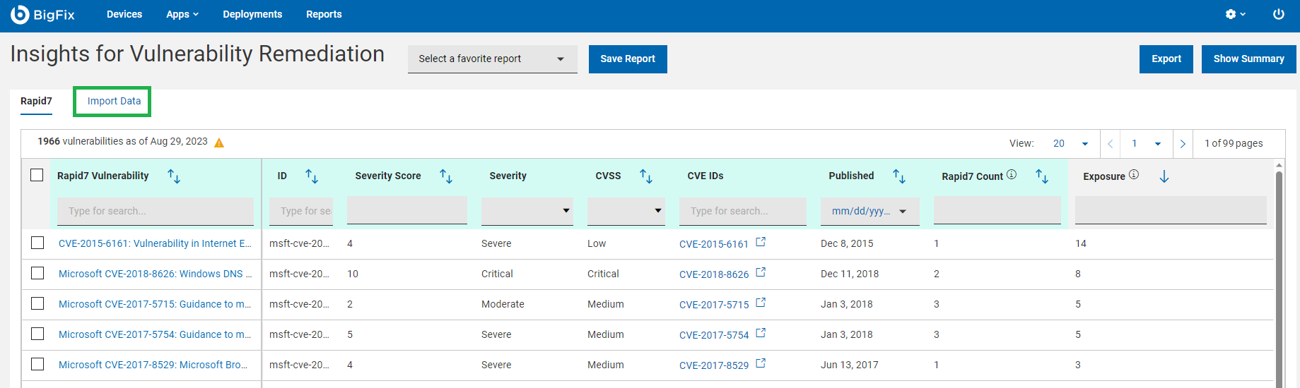 The BigFix Insights for Vulnerability Remediation (IVR) application in the WebUI provides a quick summary of all vulnerabilities in a data grid format. With the application you can remediate vulnerabilities and create custom IVR reports.
