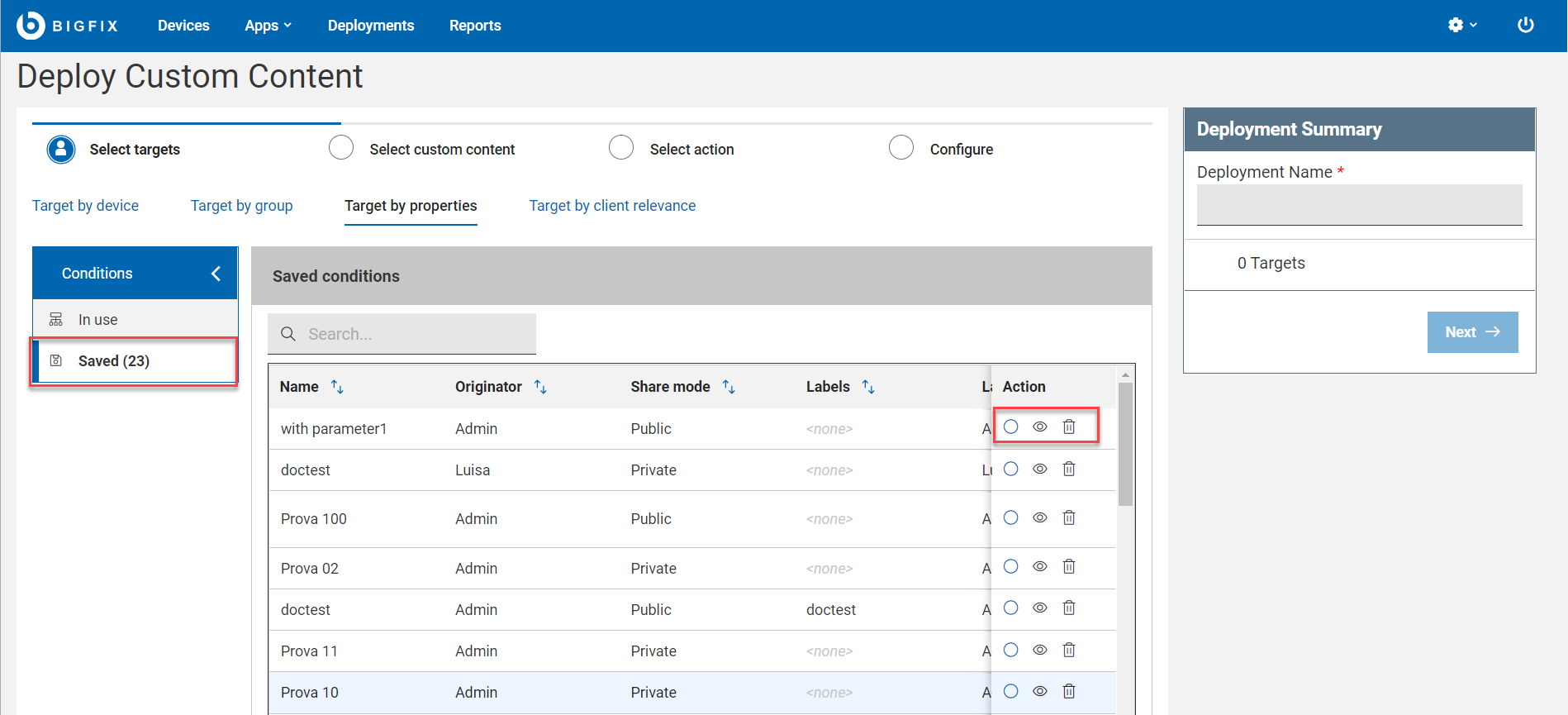You can create a Target by properties condition with reserved properties (already present in BigFix) and also with custom properties (created by users). You can define a single condition or build nested conditions using AND and OR statements.