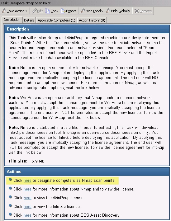 Click the first Actions box link to access the Take Action dialog. From the Target tab, select the computers that you want to designate as Scan Points.