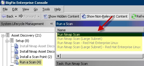 In the Setup node of the Asset Discovery navigation tree, click Run a Scan. You see that there are available tasks associated with this action. Click one of the available scans.