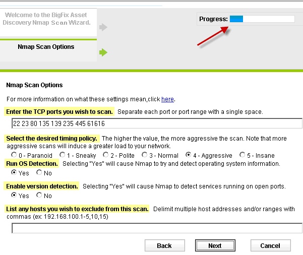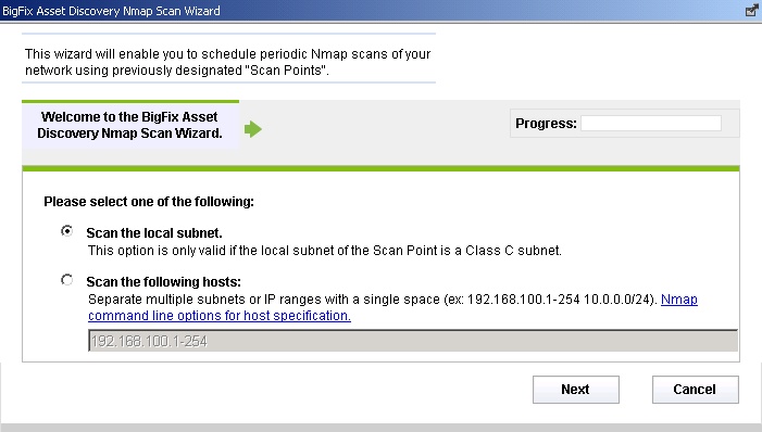 If you select Scan the local subnet, you set specific parameters of the scan in the next screen. Check the Progress bar at the top of the window.