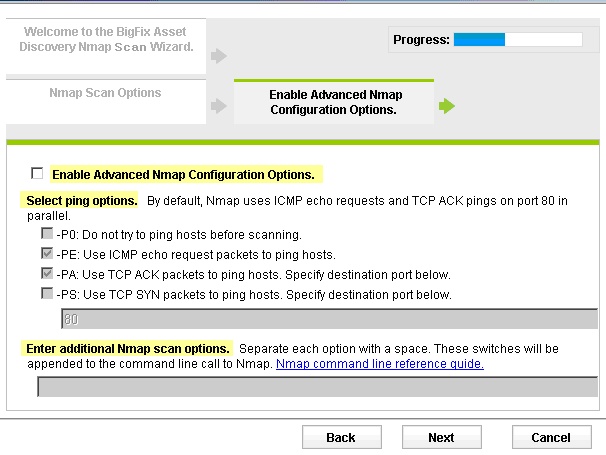 On the next screen, you can enable Advanced Nmap configuration options, select Ping Options, and additional Nmap scan options. Make your selections and click Next.