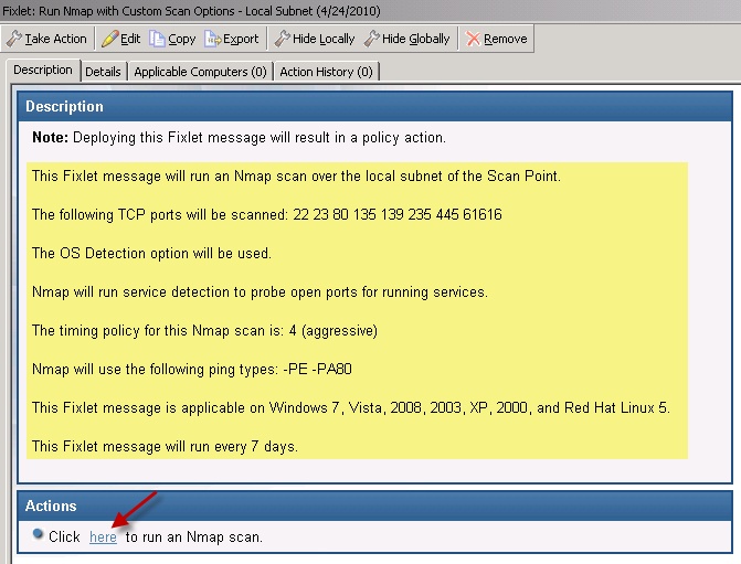 You now see the Fixlet that includes the specific parameters and customizations you entered in the wizard. Review the text in the Description field, and click in the Actions box to run an Nmap scan.