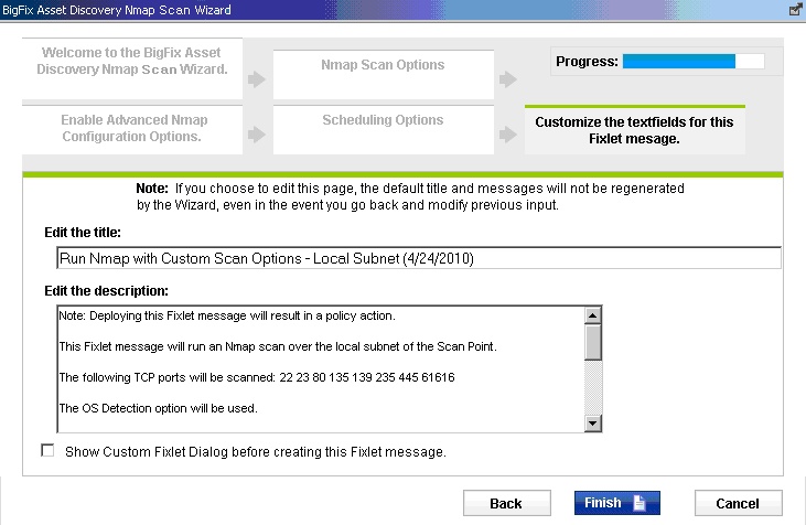 In the next screen, you can customize the text fields for the Fixlet. You can edit the title and the description of the Fixlet. When you have customized all text fields, click Finish and enter your Private Key Password.