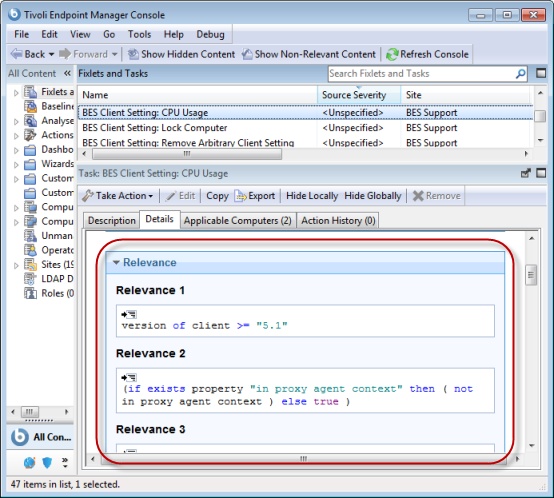 - Evaluating Fixlet relevance. This is the most common place to find the Relevance language and explains how it got its name. As you’ll see in detail below, expressions in this language are designed to trigger only when the client computer exhibits a particular state – thus the Fixlet is not displayed unless it’s relevant. You can see the Relevance expression behind each Fixlet in the IBM BigFix Console: click on a Fixlet from the list, then look at the Details tab.