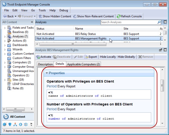 - Displaying Retrieved Properties. From the IBM BigFix Console, you can retrieve properties of the Client computers. There are some built-in properties, but you can also create your own. To see an example, select an item from the Analyses tab, then click on the subsequent Details tab.